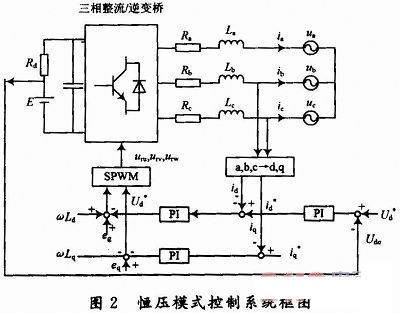 在對機車蓄電池充電時,為了快速充電同時延長電池的使用壽命,將充電與放電過程分成不同的階段,可以視具體情況分階段選擇恒流或者恒壓模式充放電。恒壓充放電模式采用電壓定向控制模式,控制框圖如圖2所示。控制策略采用雙閉環結構,外環控制直流電壓,內環控制電流。電流內環作用是提高系統的動態性能和實現限流保護,電壓外環的作用是保證直流側電壓的穩定性。直流輸出電壓給定信號和實際直流電壓Vdc比較后的誤差信號送入P1調節器,PI調節器的輸出即為主電路交流輸入參考電流的幅值,比較得到電流誤差后,對電流誤差進行PI調節,用以減緩電流在動態過程中的突變。然后再與輸入電壓的空間矢量進行比較控制,最后通過SPWM調制算法即可生成相應6路驅動脈沖控制三相整流橋IGBT的通斷,間接地控制網側電流,實現網側功率因素的調節。