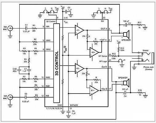 圖1所示的立體聲聲頻子系統,是一個包含立體聲聲頻喇叭加耳機和3D增強裝置的放大器。也就是說,這個裝置具有立體聲喇叭及立體聲耳機驅動功能。當電源電壓Vcc=5V時,立體聲喇叭最大輸出量可達到1.3W。當每個通道在8Ω負載下、而負載降至3Ω時,則可支援每個通道達2.1W的輸出量,而耳機能夠在32Ω負載下輸送高達80mW至每個通道。此子系統利用兩個獨立的控制接腳來控制停機和3D開關,操控方便,設計簡單,并提供耳機檢測功能。