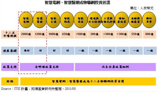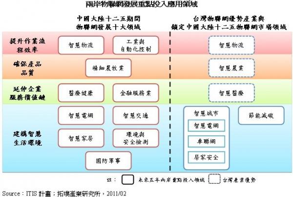 歐美經濟體危機四伏,中國大陸市場需求反而撐起全球經濟半邊天。不可諱言,面對全球不景氣環境,未來兩岸合作將是臺灣經濟得以維持成長的主要動能之一。根據拓墣產業研究所ITIS計劃顯示,目前全球皆密切關注的“中國大陸十二五規劃”中,對于通訊基礎建設和IC產業的高度重視,連帶也為“物聯網”產業的快速發展埋下伏筆。