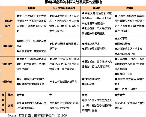 感知層一直以來都是臺廠之強項,加上中國大陸目前技術較為薄弱,短期臺灣感測芯片廠具有較大之優勢。應用部分,智能電網與智能醫療在中國大陸將是最大的應用領域與投資方向。但由于物聯網應用范圍廣大,涉及各個層面,資源難以集中發展,臺廠可藉由差異化案例作為利基,將解決方案包裝后整案輸出。例如,臺灣目前推動的智能生活計畫,所積累的物聯網發展經驗及成熟技術,如智能農業、智能醫療、智能電表等,都是臺廠可藉力使力、搶攻物聯網應用市場的機會。