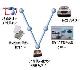 汽車電子產品軟件開發流程是“V”形開發流程。“V”形開發流程分為五個階段,即功能設計、原型仿真、代碼生成、硬件在回路仿真-HIL、標定。