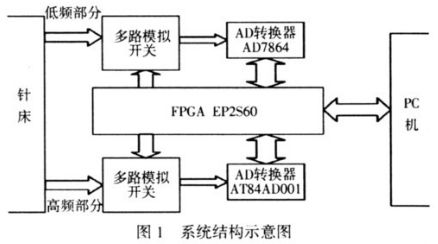 本自動測試系統(tǒng)的結(jié)構(gòu)框圖見圖1。系統(tǒng)的工作原理是:通過針床將待測信號導(dǎo)出,F(xiàn)PGA 通過控制多路模擬開關(guān)將待測信號采集進來,將數(shù)據(jù)通過相應(yīng)協(xié)議傳送到PC 機,用自動測試軟件測試各個信號是否正常。