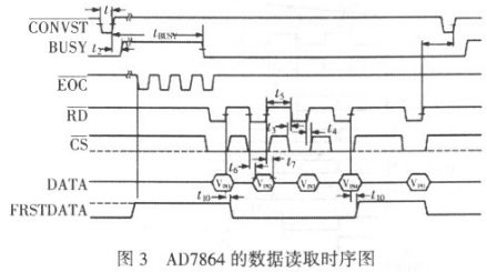 (1)低頻部分。本部分主要采集的是電源信號和電平變換信號,采用AD7864 作為采集芯片。AD7864 具有片內(nèi)時鐘、讀寫允許邏輯、多種通道選擇方式以及內(nèi)部精確的2。5 V 參考電壓,這使得其與高速處理器的接口變得非常簡單。AD7864 轉(zhuǎn)換后的數(shù)據(jù)讀取采用轉(zhuǎn)換后讀取數(shù)據(jù)的方式,其讀取時序見圖3。