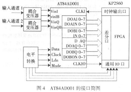 (2)高頻部分。主要是對脈沖數(shù)字信號的采集,包括頻率測量和信號采集兩個部分。脈沖數(shù)字信號的頻率是確定電路板是否工作正常的重要參數(shù),因此確定脈沖信號的頻率是否正常是本測試系統(tǒng)的必要工作。本系統(tǒng)是將待測信號接入FPGA 與53MHz 的高精度時鐘同時開始計數(shù),一段時間后,通過兩個信號的計數(shù)值來計算脈沖信號頻率的。信號采集是以AT84AD331 作為采集芯片。AT84AD331 與EP2S63 的連接見圖4。