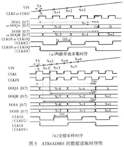 AT84AD331 可以配置成I 路和Q 路單獨使用,此時可以同時采集兩路信號,最高采樣率為1 Gs/s;也可以配置成I 和Q 路的交錯采樣,此時只能采集1 路信號,等效采樣率為2 Gs/s,使用時可以根據(jù)需要對該芯片進行在線配置。FPGA 對AT84AD331數(shù)據(jù)讀取時序見圖5。