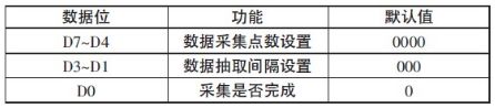其中D7~D4 為數(shù)據(jù)采集的點數(shù)設(shè)置,3333B 表示64 個,1111 表示1 324 個,步進為64。D3~D1 為數(shù)據(jù)抽取的間隔設(shè)置,333 表示抽取間隔為3,全部數(shù)據(jù)有效;111 表示抽取間隔為28,即每隔28 個點抽取一個點,步進為4。設(shè)置這幾位的目的是為了適應(yīng)信號頻率的要求,防止采集數(shù)據(jù)不足一周期的狀況發(fā)生。D3位為標(biāo)志位,功能和操作與5 bit 的寄存器的對應(yīng)位完全相同。本寄存器分高4 位和低4 位兩次設(shè)置。