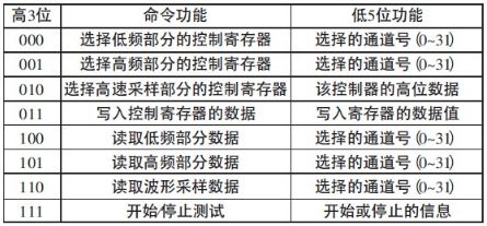PC 機發(fā)送的控制字都是8 位的,其中高3 位為控制命令字,用來區(qū)分8 個命令,低5 位為輔助功能,具體見表3。FPGA 接收到主機發(fā)來的命令信號后,按命令執(zhí)行相應(yīng)的操作。