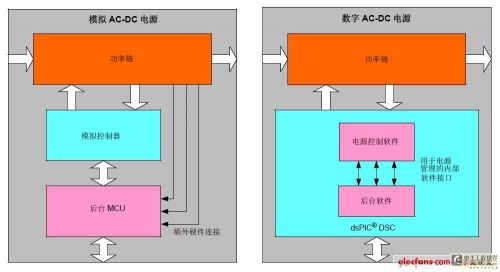 模擬電源與數字電源的功率鏈部分、驅動電路和反饋電路保持一致。圖2 分別展示了上述例子中所描述的數字電源。對于數字控制電源,專用模擬控制器和后臺管理電路可合并采用一片dsPIC??DSC 來實現。