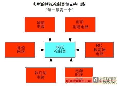 圖1和圖2僅從較高層次展示了兩者的主要差別;然而,在進行對比時所有支持電路也需包括在內。圖3 所示為每個模擬級中的支持電路,而圖4 則為數字系統中的支持電路。注意模擬控制器所需要的額外連接(在圖3 和圖4 中用箭頭標出)。
