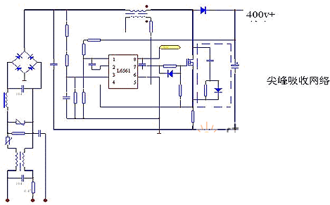 3.在低電壓時,MOS 的升壓電流更大(PWM 輸出導通較寬)MOS 溫升較高。這時可將電壓范圍設定為接近值,例如:120v~260v 時同等負載測試時,可將電感的感量及匝數,按照260v 時的輸入值,設定并最大可能減少次級匝數。在120v 時可將輸入最低電壓設定為110v最大限度增加電感感量,使母線在110v 滿載時輸出達到額定的400v。在260v 時設定次級是由于輸入電壓升高,輸入電流減小會使次級電壓下降,5 腳電流采樣失效,使芯片進入重新啟動(誤以為空載)母線不斷脈動的重新啟動。110V 調試時感量大,可減少因輸入電壓低而導致的PWM 頻率太高,帶來的MOS 開關損耗,感量大時亦可有效減少峰值電流的值。另一減少MOS 溫升的方式是并聯一路吸收網絡。電阻并聯高速二極管后在串聯一只電容可使MOS 開關時的尖峰反向電壓得到有效吸收。(小功率無明顯優勢)。
