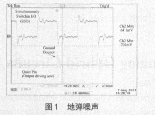 模擬信號與數(shù)字信號相比,對噪聲的敏感程度要大得多,因為模擬電路的工作依賴連續(xù)變化的電流和電壓,任何微小的干擾都能影響它的正常工作,而數(shù)字電路的工作依賴在接收端根據(jù)預先定義的電壓電平或門限對高電平或低電平的檢測,具有一定的抗干擾能力。但在混合信號環(huán)境中,數(shù)字信號相對模擬信號而言是一種噪聲源。數(shù)字電路工作時,穩(wěn)定的有效電壓只有高低電平兩種電壓。當數(shù)字邏輯輸出由高電壓變?yōu)榈碗妷海撈骷慕拥毓苣_就會放電,產(chǎn)生開關(guān)電流,這就是電路的開關(guān)動作。數(shù)字電路的速度越快,其開關(guān)時間一般也要求越短,當大量的開關(guān)電路同時由邏輯高電平變?yōu)檫壿嫷碗娖綍r,由于地線通過電流的能力不夠,大量的開關(guān)電流就會引起邏輯地電壓發(fā)生波動,我們稱為地彈。如圖1 所示。數(shù)字電路造成的地彈噪聲和電源擾動,如果耦合到模擬電路中,就會影響模擬電路的工作性能。由于相當多的干擾源是通過電源和地總線產(chǎn)生的,其中地線引起的噪聲干擾最大,所以在PCB 設計時對地和電源的設計就顯得尤為重要。