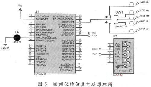 測頻儀的硬件電路主要包括兩個方面:頻率測量電路和數據通信電路。頻率測量是指使用PIC18F452的CCP模塊測量外部脈沖信號的頻率;數據通信是指將測量得到的數據通過串口傳至PC機進行處理。測頻儀的硬件電路如圖3所示。