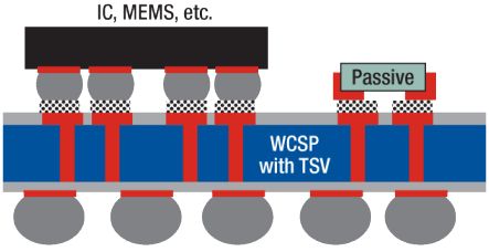 隨著 WCSP 的發(fā)展,我們將見(jiàn)證 TSV 互連技術(shù)的融合,其提供有源端到裸片后端的電氣連接。這種能力允許 IC 或者其他組件(MEMS、無(wú)源組件等)堆疊,從而構(gòu)建起高集成度的芯片組或者系統(tǒng)級(jí)封裝 (SiP) 系統(tǒng)。