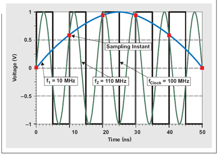 圖 1 100MSPS 采樣的兩個輸入信號顯示了混疊帶來的相同采樣點