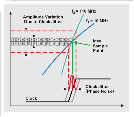 仔細觀察某個采樣點,可以看到計時不準(時鐘抖動或時鐘相位噪聲)是如何形成振幅變化的。由于高 Nyquist 區域(例如,f1 = 10 MHz 到 f2 = 110 MHz)欠采樣帶來輸入頻率的增加,固定數量的時鐘抖動自理想采樣點產生更大數量的振幅偏差(噪聲)。另外,圖 2 表明時鐘信號自身轉換速率對采樣時間的變化產生了影響。轉換速率決定了時鐘信號通過零交叉點的快慢。換句話說,轉換速率直接影響 ADC 中時鐘電路的觸發閾值。