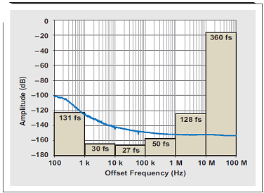 時鐘鏈(振蕩器、時鐘緩沖器或 PLL)中器件的輸出抖動一般規定在某個頻率范圍內,該頻率通常偏離于基本時鐘頻率 10 kHz 到 20 MHz(單位也可以是微微秒或者繪制成相位噪聲圖),可以將其整合到一起獲取抖動信息。但是,低端的 10kHz 和高端的 20MHz 有時并非正確的使用邊界,因為它們調試依賴于其他系統參數,我們將在后面進行詳細介紹。圖 6 描述了設置正確整合限制的重要性,圖中的相位噪聲圖以其每十倍頻抖動內容覆蓋。我們可以看到,如果將下限設定為 100-Hz 或 10kHz 偏移,則產生的抖動便極為不同。同樣地,例如,設置上整合限制為 10 或 20MHz,可得到相比 100MHz 設置極為不同的結果。