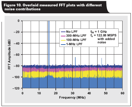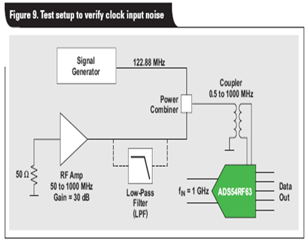 若想要驗證時鐘相位噪聲是否需要整合至時鐘輸入帶寬,則需建立另一個實驗。ADS54RF63 再次工作在 122.88 MSPS,其輸入信號為 1GHz,以確保 SNR 抖動得到控制。我們利用一個 RF 放大器,生成 50MHz 到 1GHz 的寬帶白噪聲,并將其添加至采樣時鐘,如圖 9 所示。之后,我們使用幾個不同低通濾波器 (LPF) 來限制添加至時鐘信號的噪聲量。