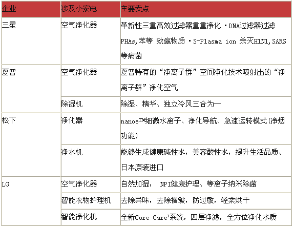 除LG外,松下、夏普、三星等外資企業均在持續推出小家電產品,主要涉及空氣凈化器和凈水機兩大產品線,其中空氣凈化器是涉足比較多的一類產品。