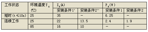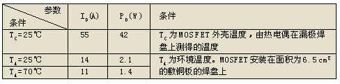 在DC/DC轉換器中,MOSFET工作在占空比變化的脈沖狀態,但也不是工作于窄脈沖狀態;工作溫度范圍是-40~85℃。表1、表2中無這種工作條件下的ID及PD值。ID可在下面的范圍內選取:(TA=70~85℃時的ID)