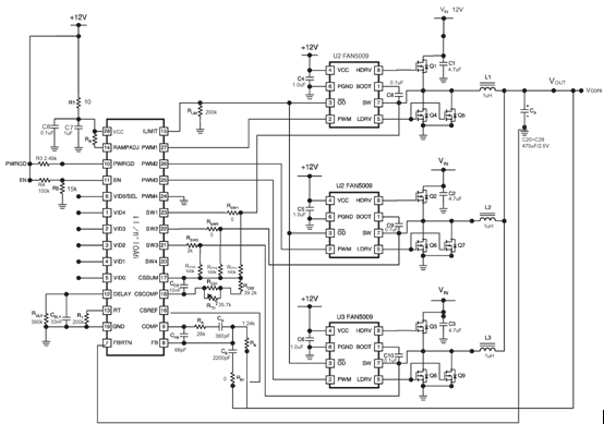 由控制器FAN5019B及3個驅動器FAN5009組成的三相同步整流降壓式DC/DC轉換器電路如圖7所示。現使用條件:VIN=VCC=12V(VCC是供控制器及驅動器的工作電壓),VOUT=1.5V,IO=65A(IO即IOUT(max)),fsw=228kHz,選擇開關管及同步整流管(采用兩個并聯組成)。