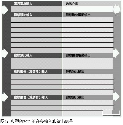 ECU 利用許多信號來監(jiān)控汽車及其環(huán)境,進(jìn)而管理與控制引擎和輔助設(shè)備,以達(dá)到最佳的運(yùn)作狀態(tài)。圖1摘要了典型的ECU 的許多輸入和輸出信號。