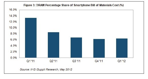 據(jù)IHS iSuppli公司的DRAM動(dòng)態(tài)簡(jiǎn)報(bào),雖然智能手機(jī)的材料清單(BOM)成本穩(wěn)步上升,但一年來DRAM在其中所占的份額卻下降了一半以上,主要是因?yàn)镈RAM價(jià)格下跌。