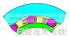圖3:踩下離合器的狀態。向左旋轉保持器時,滾柱會向圓頂較低位置移動,進入由內輪與外輪相夾而成的楔形空間。