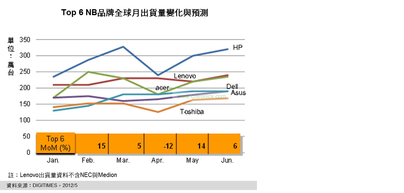 DIGITIMES Research資深分析師兼主任簡佩萍分析,品牌與代工廠NB月出貨量方面,在歷經(jīng)低迷的4月后,5月搭配英特爾(Intel)新品NB鋪貨效應,出現(xiàn)兩位數(shù)的月成長幅度;但整體而言仍較先前預測的出貨成長緩和許多,尤其對6月份的出貨展望,全球前6大品牌普遍保守,預期前6大品牌月NB出貨量成長幅度也將因此驟降至個位數(shù)。