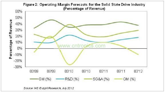 上次SSD產業出現營業利潤普遍為負的情況是在2010年上半年,與目前的情形類似。當時,幾家廠商加大銷售力度,以改善略高于35%的毛利率。這些努力取得了一些效果,2011年中期毛利率自2009年以來首次升到了40%以上。但由于產業競爭加劇和營業費用增加,SSD毛利率在2011年第四季度重新跌至40%以下。