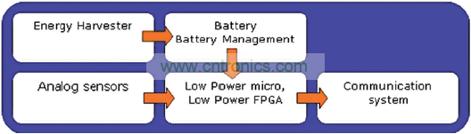 能量采集系統的工作原理是收集能量以將其存儲在電池中: 系統通常由電池供電,而非由能量采集器直接供電。因此,能量采集器供電的系統實際上在結構方面非常類似于傳統的電池供電產品(參閱圖 2)。