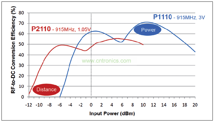許多采集技術仍是開發工作的重點。 但是,OEM 可以利用現成商用組件實施當前切實可行的能量采集電源系統。小型電子設備的無線電頻率 (RF) 和太陽能采集目前都受到組件制造商的支持。 就 RF 能量采集而言,美國制造商Powercast 提供了 P1110 和 P2110,它們能將 850MHz 至950MHz 頻率范圍內的無線電發射轉換為輸出電壓介于 1.8V與 4.2V 之間的 DC 電能,如圖 4 所示。設備可以使用 1GHz以下頻率波段中的雜散 RF 發射提供功率輸出,以便為嵌入主機設備的電池充電。 無線傳感器是通過 P1110 或 P2110使用環境 RF 能量的典型終端產品。