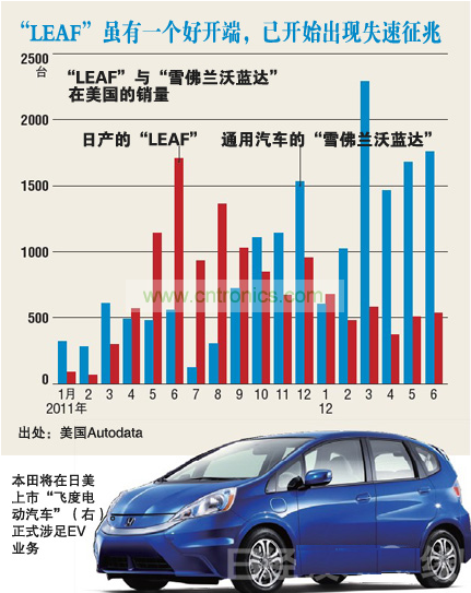 下圖為美國調查公司Autodata統計的、LEAF在美國市場的銷量走勢。該車于2010年12月上市,2011年銷勢良好,但進入2012年之后銷售速度減慢,截止6月份已連續三個月低于上年同月。與競爭車型——美國通用汽車(GM)的“雪佛蘭·沃藍達”在銷量上發生了逆轉。
