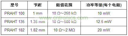 PRAHT系列的節距為1mm、1.35mm或1.82mm,阻值為10?~2M?,每個電阻的功率等級為10mW~20mW。器件具有小于-35dB的低噪聲,電壓系數小于0.01ppm/V。符合RoHS的電阻網絡提供工作溫度可達+230℃的金端接,或溫度為+200℃的SnAg端接。