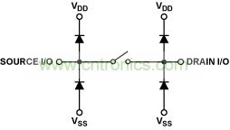 信號源、漏極和邏輯控制端對正負源電壓都設計有箝位二極管以提供ESD保護,如圖1所示。在正常工作模式下,這些二極管反向偏置,因此除非信號超過電源電壓,否則不會通過電流。這些二極管的尺寸因工藝而異,不過一般都采用小型設計,以盡量減少正常工作時的漏電流。