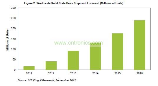 預計2013年SSD出貨量將達到9200萬個,而今年和去年分別是4100萬和1700萬個,如圖所示。明年過后仍將強勁增長,保持兩位數的速度,直到2016年,屆時預計SSD出貨量將達到2.4億個。