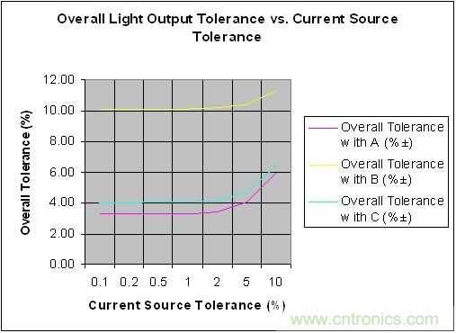 表2和圖3給出了整體容差和一列假設電流源容差的對比情況,此時假設LED光輸出在350mA的區域內隨前向電流呈線性變化。