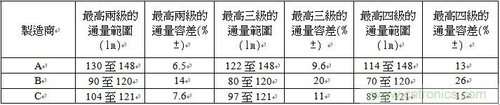 表3:相同的LED所具有的高階兩級、三級、四級光通量分級下的容差值