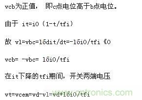 因此,在關(guān)斷過(guò)程一開始,vt立即從零上升到vcem,it在從i0下降至零期間,vt=vcem不變。直到it=0、id=i0以后,vt才下降為電源電壓vd,如圖5(b)所示。vcem超過(guò)vd的數(shù)值取決于lб、tfi和負(fù)載電流i0,顯然過(guò)快的電流下降率di/dt(即tfi小)、過(guò)大的雜散電感l(wèi)б或負(fù)載電流過(guò)大都會(huì)引起關(guān)斷時(shí)元件嚴(yán)重過(guò)電壓,且伴隨著很大的功耗。