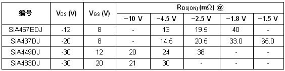 對于電源管理中的負載和電池開關,以及智能手機、平板電腦、移動計算設備、硬盤驅動器和固態驅動的同步降壓轉換應用里的控制開關,-12 V SiA467EDJ提供了13m?(-4.5V)的極低導通電阻。-20V SiA437DJ的導通電阻為14.5m?(-4.5V),-30V SiA449DJ和SiA483DJ的導通電阻分別只有20m?(-10V)和21m?(-10V)。另外,SiA437DJ和SiA467EDJ的電流等級高達30A,承受很大的涌入電流,可用于負載開關。
