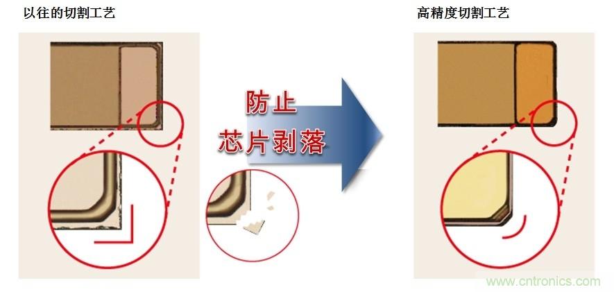 ROHM通過采用與以往不同的、獨創的微細化技術,在開發制造系統的同時,改進切割方法,在切割工藝上將封裝尺寸公差大幅降至±10μm。通過提高尺寸精度,消除毛刺和碎片,有助于減少貼裝時的吸著誤差以及提高貼裝精度。