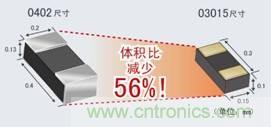 03015電阻器在量產的電子零部件中達到了最小型。相比以往的0402產品,成功地將尺寸降低了56%。