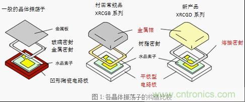 一般的晶體振蕩子采用的是凹形陶瓷電路板,本公司采用的是跟CERALOCK®相同的平板型電路板。因此提高了包裝內(nèi)部的空間利用率,與一般的晶體振蕩子相比能搭載更大的晶體元素。此外,由于金屬帽和電路板連接,常規(guī)產(chǎn)品采用的是樹(shù)脂封裝,XRCGD系列采用的是熔接封裝,通過(guò)密封構(gòu)造對(duì)應(yīng)了頻率的高精度化。(圖1)