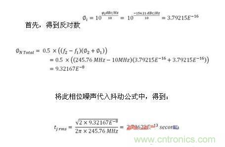 本文將采用低抖動時鐘發生器AD9523為雙通道、14位、250 MSPS ADC AD9643提供時鐘。 使用這些產品后,常見的時鐘頻率為245.76 MHz,因此針對AD9523將采用30.72 MHz基準電壓源(外部振蕩器),并設置內部寄存器,以生成AD9643的低抖動時鐘輸出。根據時鐘輸入和相位噪聲的抖動計算公式: