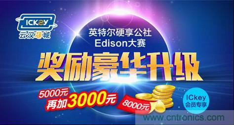 英特爾Edison設計大賽是一個尋找國內新生創客的舞臺。ICkey(云漢芯城)此次應邀加盟英特爾Edison設計大賽,將為大賽全國30強選手每人提供價值5000元的電子元器件及開發板等產品的資源贊助。(如果你是ICkey社區會員并進入大賽全國30強,更有機會贏得最高價值8000元的資源贊助獎勵!詳情請見http://bbs.ickey.cn/group-topic-id-43691.html)