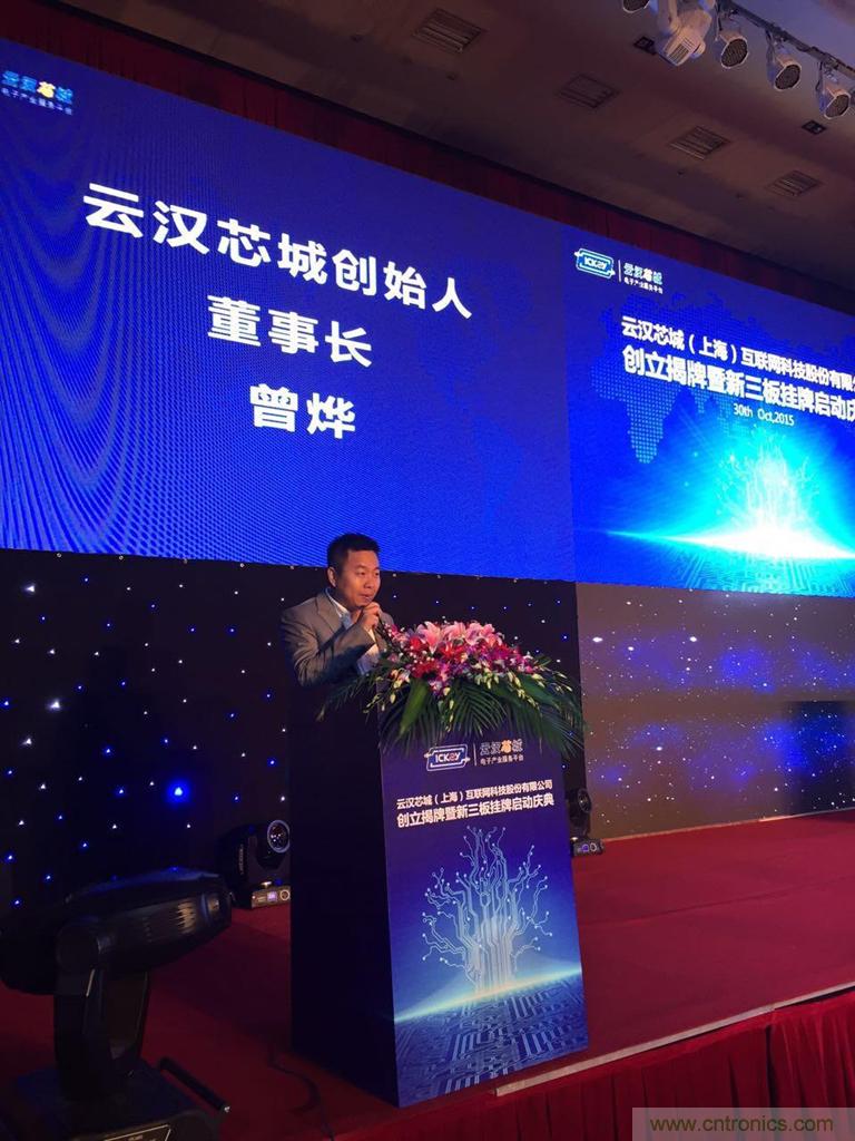 啟動儀式上,云漢芯城創始人、董事長曾燁介紹了公司在傳統電子產業耕耘多年后毅然轉戰互聯網的蛻變歷程,并宣布云漢芯城已順利完成股改,成功啟動新三板掛牌。上海云漢電子有限公司正式更名為云漢芯城(上海)互聯網科技股份有限公司(以下簡稱“云漢芯城”)。