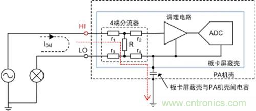 3.電流通道接入高端和低端,測量結果也不同,內部板卡屏蔽殼與機殼間多少都會存在一些雜散電容(空間中兩個絕緣導體中存在電容),若電流通道接入高端,產生泄漏電流(圖3中紅色標記線),因此電流測量輸入應當串在共模電壓較低的地方(低端)。