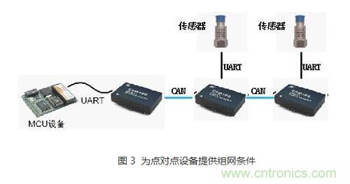 我們都知道CAN總線是一種多主總線,可以實現多節點組網通訊,自帶優先級仲裁機制,可有效防止數據沖突?;谶@一優點,可以利用CSM100模塊為點對點通訊設備提供組網的條件。例如,某些串口接口的傳感器,如果我們需要把多個傳感器的數據讀到MCU而MCU的串口數量不足怎么辦呢?