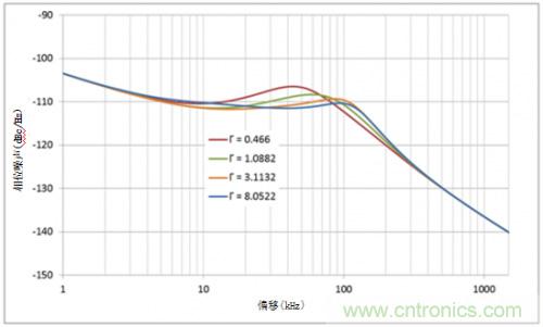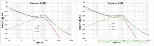 圖2所示為伽馬對相位噪聲的影響。回路帶寬和相位邊限相同,而伽馬值不同。伽馬值越高,由于噪聲整形回路濾波器平緩度提升,VCO的提升斜率也會變低。