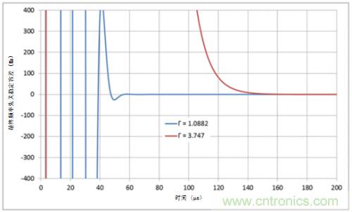 但較高的伽馬值也有其蔽處:鎖定時間更長。圖4所示為不同伽馬值下200MHz頻率躍變的鎖定時間;回路帶寬和相位邊限保持不變。當(dāng)伽馬值和回路帶寬分別為1和3.7,穩(wěn)定容差在±100Hz范圍內(nèi),模擬鎖定時間值分別為46.5µs與118µs。