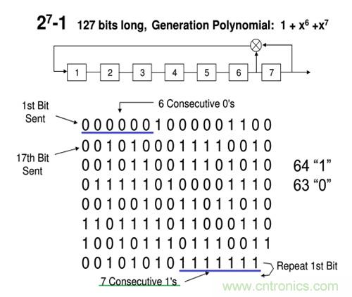 同理,PRBSn的碼長為2n-1 bits,其中包括2n-1個‘1’,2n-1-1個‘0’。